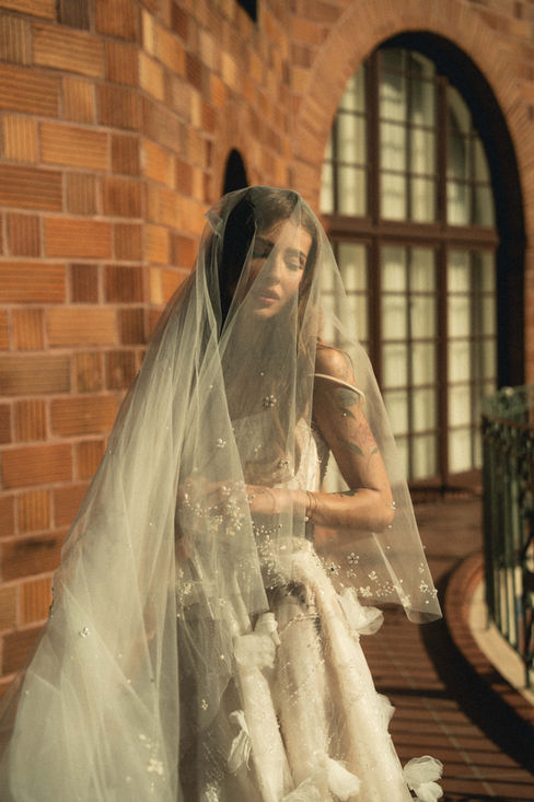 LittleDove’s gown is a dream—lace detailing, floral appliqués, and a long veil covered in delicate beads in the shape of flowers that shimmer with every movement. As she stands on the grand staircase, her veil flows down the steps, creating a breathtaking composition.